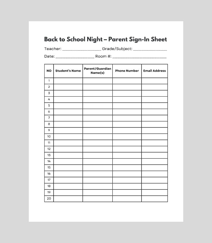 Equip your classroom for Back to School Night with this professional Back to School Night sign-in sheet PDF. This editable 8.5×11 form helps you easily track every parent/guardian who attends your Open House or Meet-the-Teacher event. Use it to collect student names, parent names, email addresses, and phone numbers in one organized place. At events like Open House, having a sign-in sheet “fosters open communication, building trust, and creating a sense of community” between families and teachers. In fact, a sign-in sheet is specifically designed to record parent attendance and provide proof that important information was shared