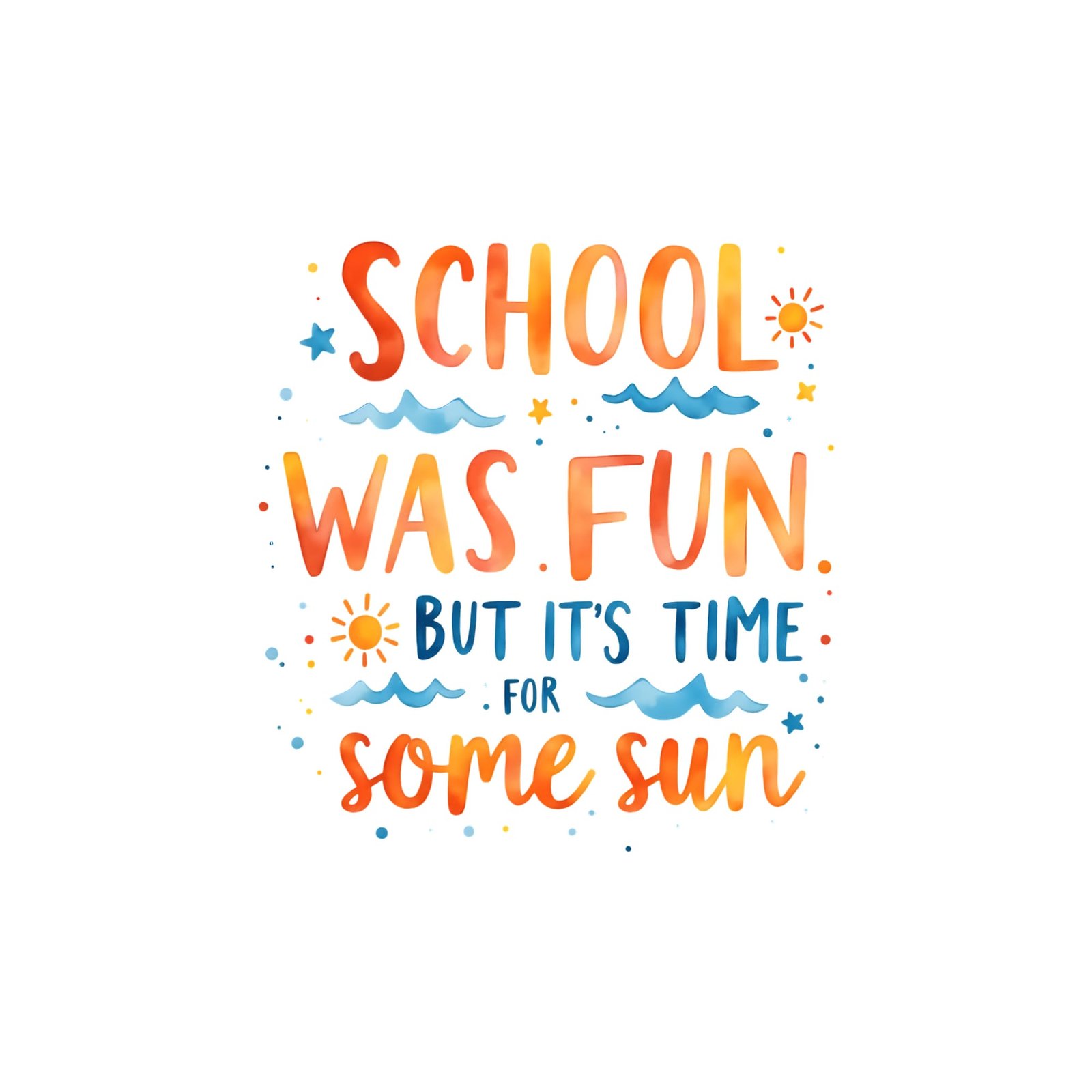 School Was Fun But It’s Time For Some Sun SVG & PNG is the perfect cheerful design to celebrate the end of term, packed with vibrant colours and a playful summer vibe. Whether you’re crafting for teachers, students, or parents, this hand-lettered artwork brings a sunny burst of positivity to your projects. The School Was Fun But It’s Time For Some Sun SVG & PNG design features warm orange gradients, cool blue waves, and lively decorative doodles that instantly lift the mood and make it ideal for end-of-year gifts.
