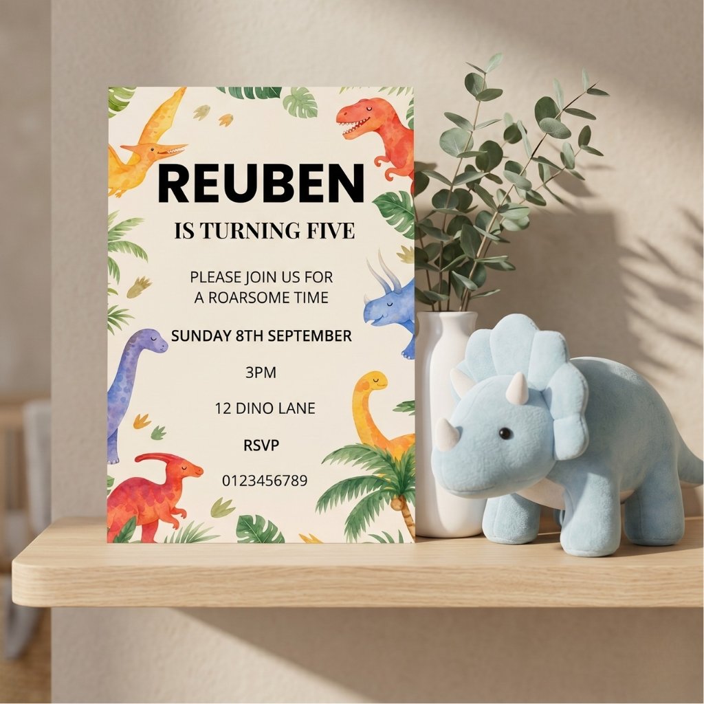 The gentle watercolour style keeps things modern and stylish, while still being playful enough for kids. Whether you’re planning a fifth birthday like Reuben’s or any dino-themed celebration, these dinosaur invitations create a cohesive and memorable first impression.